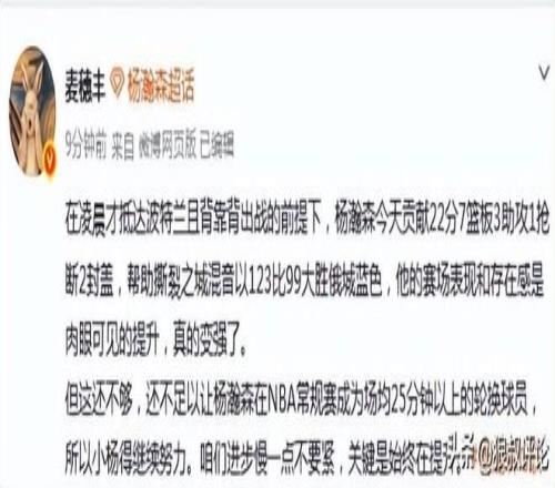 媒体人“麦穗丰”发文点评:在凌晨才抵达波特兰且背靠背出战的前提下,杨瀚森今天贡献22分7篮板3助攻1抢断2封盖,帮助撕裂之城混音以123比99大胜俄城蓝色,他的赛场表现和存在感是肉眼可见的提升,真的变强了。