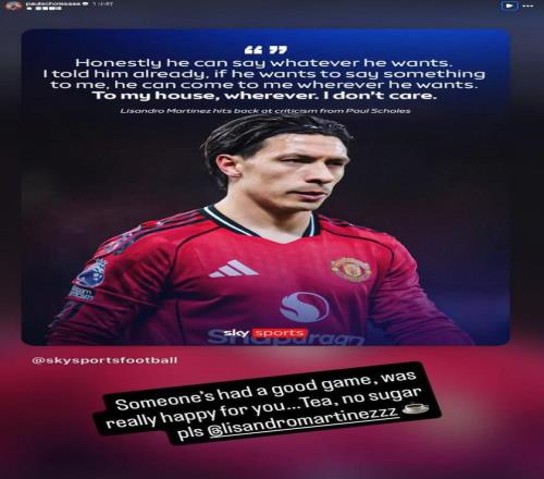 曼联名宿斯科尔斯在曼市德比前质疑利桑德罗-马丁内斯防不住哈兰德,这位曼联后卫在赛后接受采访时表示斯科尔斯如果想说什么可以去他家,对此,斯科尔斯在社交媒体回应了利桑德罗-马丁内斯的采访。