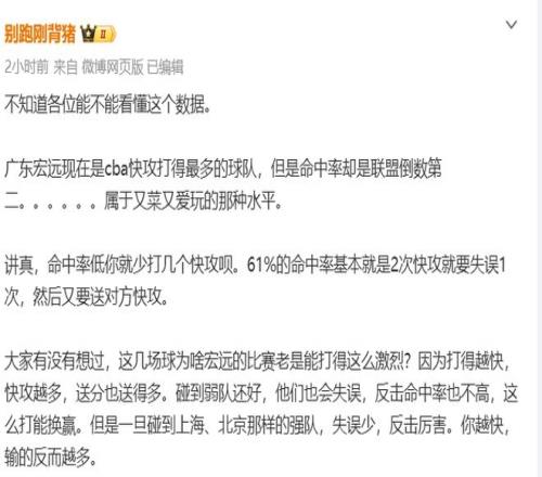 不妨来看看媒体人“别跑刚背猪”赛后给出的数据分析:广东宏远现在是cba快攻打得最多的球队,但是命中率却是联盟倒数第二。大家有没有想过,这几场球为啥宏远的比赛老是能打得这么激烈?因为打得越快,快攻越多,送分也送得多碰到弱队还好,他们也会失误,反击命中率也不高,这么打能换赢但是一旦碰到上海、北京那样的强队,失误少,反击厉害。你越快,输的反而越多。